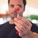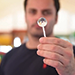 The Magician explains that he's going to show how lollipops are made. He takes a bottle and blows through a circular ring to make some soap bubbles in round ball shapes. Magically he is able to catch one of the balls, as it has turned solid! He attaches the ball to a stick, he waves the stick, and visually it becomes a real lollipop that can be given to a member of the audience.
