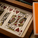 Lounge Edition in Hangar Orange, the deck provides an upgraded feel over the Standard Back version. The cards showcase re-colored standard faces and have an untraditional offset classic and casino inspired back design that pays homage to a vintage regional airline of years past with the orange colorway. On the Limited Back version, the back design is upgraded with both silver foil and clear UV spot varnish. The cards are traditionally cut to provide the ability to weave or faro shuffle facedown. The tuck box exhibits premium features with a durable synthetic stock material, clear UV spot varnish, and more silver foil than the Standard Back version.