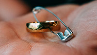 An ordinary safety pin is fully examined by the audience.
